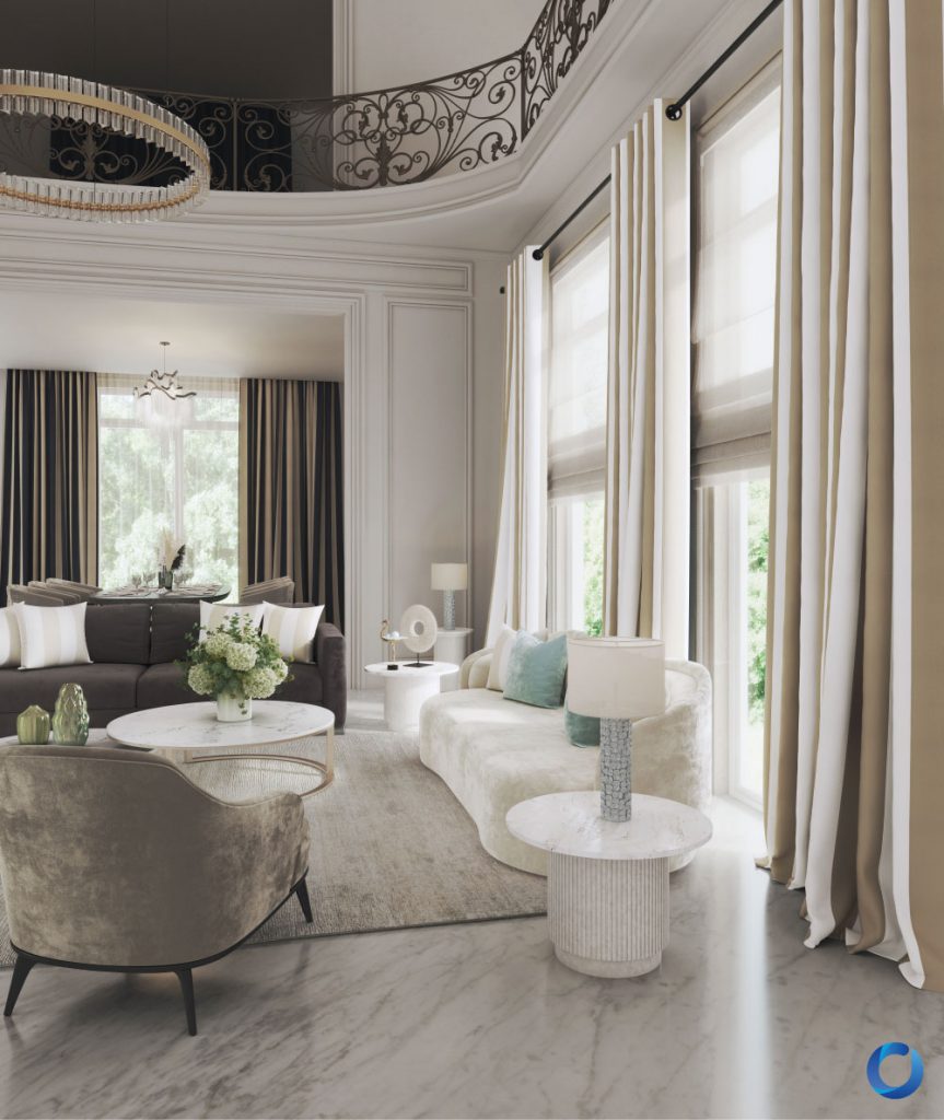 Langsir yang digantung dari siling memberikan kesan ruang yang lebih luas dan tinggi. Teknik ini sering digunakan dalam ruang tamu atau bilik tidur untuk mencipta suasana mewah dan elegan.